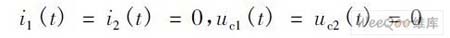 該方程組含有4 個未知數(shù):i1( t),i2( t),uc1(t),uc2( t),其定解條件直接由電路的初始儲能情況給出。當(dāng)無初始儲能時,為齊次初始條件,即: