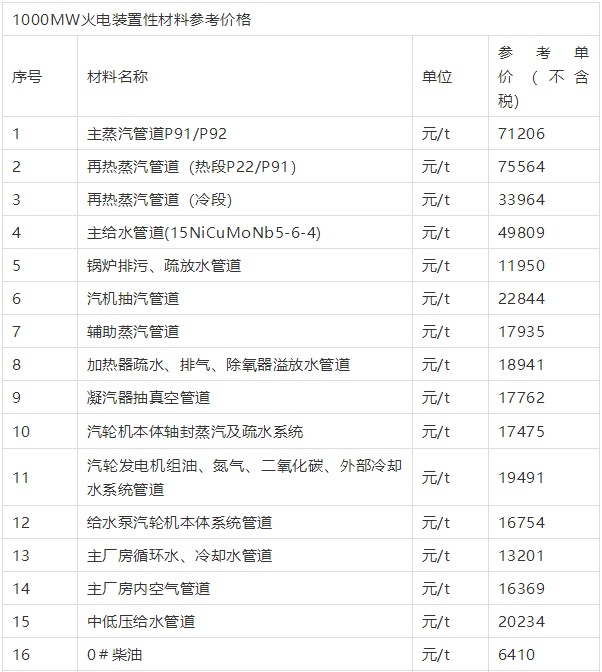 你想知道的1000MW火電機組裝置性材料參考價格全在這里
