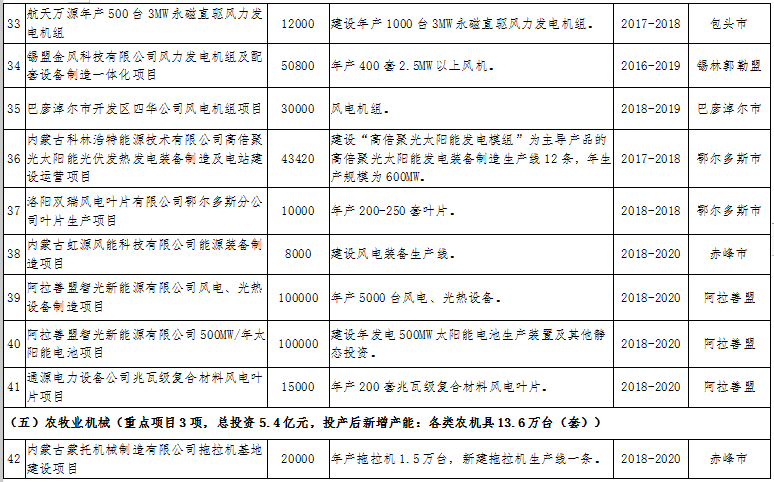 新能源設備。緊盯國際國內(nèi)儲能技術革新,引進大容量儲能技術產(chǎn)業(yè)化應用項目,培育新產(chǎn)業(yè)。壯大太陽能電池組件制造產(chǎn)業(yè),提升大型光伏電站設備自給率,推進光伏全產(chǎn)業(yè)鏈建設,到2020年,太陽能電池組件產(chǎn)能達到1000兆瓦。支持發(fā)電企業(yè)與風電設備制造企業(yè)合作,提高風電設備制造企業(yè)產(chǎn)能利用率。