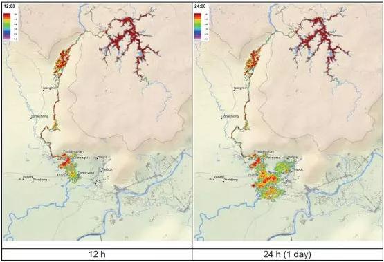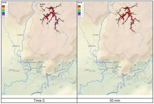 下圖為從潰壩開始,不同時間后洪水演進的計算分析結果。
