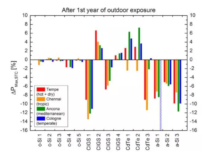 & 9658;c-Si晶體硅和HIT組件基本上隨時(shí)間穩(wěn)定持續(xù)衰減。& 9658;碲化鎘CdTe組件具有1-4個(gè)月的隨溫度影響的亞穩(wěn)態(tài)波動(dòng),然后穩(wěn)定持續(xù)衰減。& 9658;銅鋅錫硫CIGS組件具有1-12個(gè)月無(wú)規(guī)律的亞穩(wěn)態(tài)波動(dòng),然后穩(wěn)定持續(xù)衰