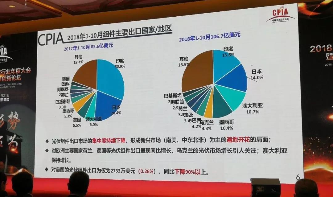 組件出口方向,集中度繼續(xù)了前幾年的趨勢,在逐漸降低。印度市場占3成,今年砍掉一半,日本也下降了10個百分點(diǎn)。很多新興市場也在發(fā)展當(dāng)中。