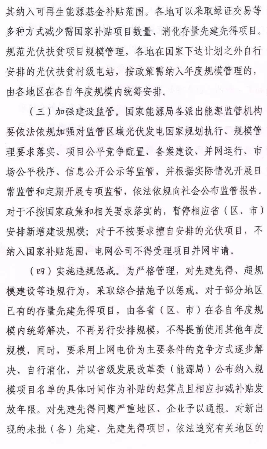 自2018年起,各地要嚴(yán)格禁止未批(備)先建和先建先得,需納入規(guī)模管理的光伏項(xiàng)目不得提前建設(shè),不得再出現(xiàn)新的先建先得項(xiàng)目,同時(shí)國(guó)家不再將其納入可再生能源基金補(bǔ)貼范圍。