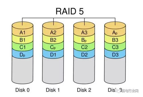 RAID 5:在RAID 3的基礎(chǔ)上有所區(qū)別,同樣是相當(dāng)于是1塊盤的大小作為校驗(yàn)盤,n-1塊盤的大小作為數(shù)據(jù)盤,但校驗(yàn)碼分布在各個(gè)磁盤中,不是單獨(dú)的一塊磁盤,也就是分布式校驗(yàn)盤,這樣做好處多多。最多壞一塊盤。n最少為3。