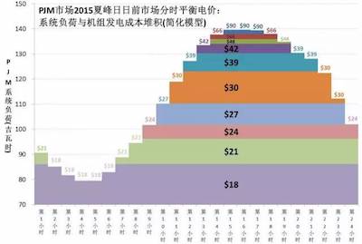 圖3  美國(guó)PJM市場(chǎng)2015年夏峰日日前市場(chǎng)分時(shí)電價(jià)及發(fā)電成本堆積圖