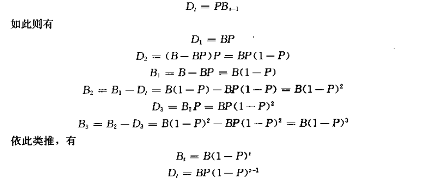 所謂余額遞減法其特點(diǎn)是第t年的折舊費(fèi)D,總是前一年尚未收回的投資,即余額的一個(gè)固定比例數(shù)。設(shè)P為比例常數(shù),Bt-1為第t年初尚未收回的投資,則有