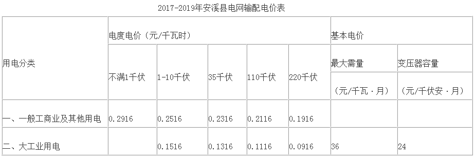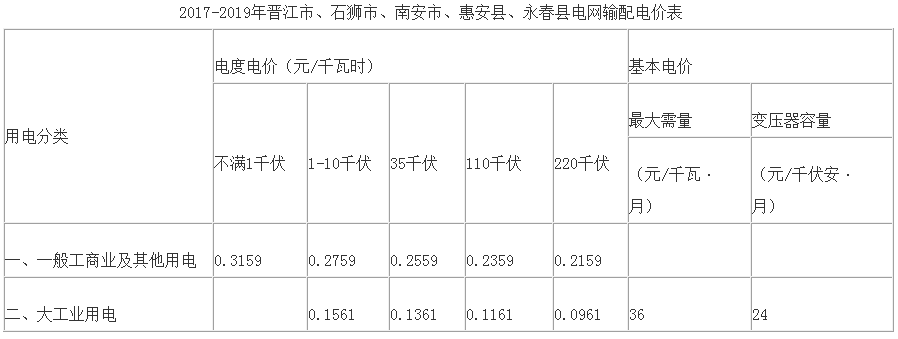 2017-2019年國網(wǎng)福建電力公司輸配電價公布