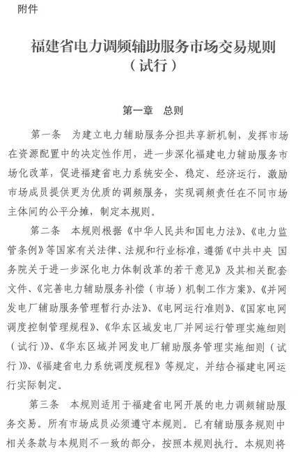 福建能監(jiān)辦日前發(fā)布了《關(guān)于福建省電力調(diào)頻輔助服務(wù)市場(chǎng)啟動(dòng)運(yùn)行有關(guān)工作的通知(閩監(jiān)能市場(chǎng)〔2018〕139號(hào))》、關(guān)于印發(fā)《福建省電力調(diào)頻輔助服務(wù)市場(chǎng)交易規(guī)則(試行)》的通知(閩監(jiān)能市場(chǎng)〔2018〕140號(hào)),定于2018年12月18日起福建電力調(diào)頻輔助服務(wù)市場(chǎng)啟動(dòng)模擬測(cè)試運(yùn)行。