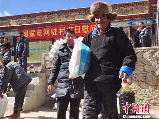 西藏農(nóng)牧民手拿慰問品。國家電網(wǎng)供圖攝