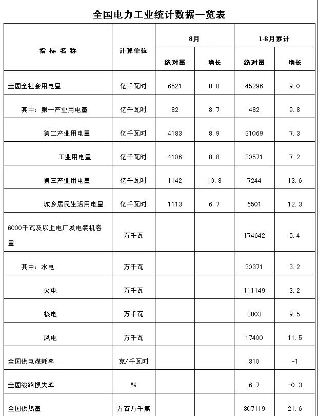 9月18日,國家能源局發(fā)布1~8月份全國電力工業(yè)統(tǒng)計數(shù)據(jù)。