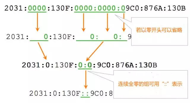 若以零開頭可以省略,連續(xù)全零的組可用“::”表示