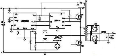 新型IBA電源系統方法需要兩級轉換:首先是非穩(wěn)壓隔離級,然后是多個緊密調節(jié)的負載點板上安裝的DC/DC電源模塊。隔離級(稱作中間總線轉換器)的拓撲結構一般是開環(huán)、非穩(wěn)壓、自由運行“直流變壓器”,被選擇用來隔離和降低總線電壓,同時保證低成本和高功率轉換效率(大于95%)。雙輸出LM5033 PWM控制器和LM5100半橋驅動器構成一個理想的芯片組解決方案,能將這些中間總線轉換器設計中需要的外部元件成本和數量降至最低。