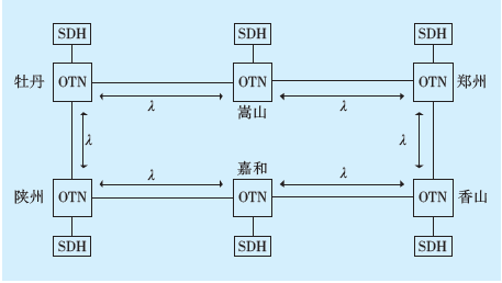 為提升波道的利用率,降低工作復(fù)雜度,在OTN系統(tǒng)的每2個相鄰節(jié)點之間,均開通一個備用波道,使該波道在每個站點都能進(jìn)行電交叉,在每個站點將SDH設(shè)備與OTN系統(tǒng)相連,如圖2所示。在OTN的相應(yīng)環(huán)網(wǎng)中,通過交叉連接,可配置任意2個節(jié)點之間的光路[8-10]。
