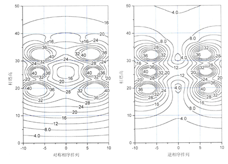 目前ADSS光纜已被廣泛用在220KV及以下電壓等級(jí)的線路中,且多屬于老線路通信改造,因此,ADSS的架掛條件受到了一定的限止。ADSS光纜的懸掛點(diǎn)應(yīng)通過精心設(shè)計(jì),尤其是220KV雙回路線路必須嚴(yán)格計(jì)算場(chǎng)強(qiáng)分布。計(jì)算結(jié)果表明:當(dāng)雙回供電線路在單側(cè)停電時(shí),原設(shè)計(jì)掛點(diǎn)上的場(chǎng)強(qiáng)變化很劇烈,完全有可能遠(yuǎn)遠(yuǎn)超過護(hù)套能承受的程度而造成故障。另外,在停電和送電瞬間的充放電足以在受污染的光纜表面引起電弧。計(jì)算結(jié)果還表明:雙回路都屬A、B、C對(duì)稱排列是最惡劣情況,即可用于ADSS光纜懸掛的空間最??;而逆相排列,即線路相位排列為ABC—CBA情況下,可用于ADSS光纜懸掛的空間最大,詳見圖3。