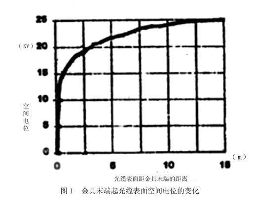光纖復(fù)合地線(OPGW)已有二十余年的運(yùn)行經(jīng)驗(yàn),技術(shù)比較成熟,至今很少有因短路電流而造成OPGW故障的案例,但卻有因遭雷擊造成故障的多起案例。據(jù)日本報(bào)導(dǎo),日本中部電力公司安裝了2500公里的OPGW,從1983—1992年的10年間,共發(fā)生了10次雷擊斷股。我國(guó)的湖北雙至河南的南洋500KV的307.4公里的OPGW光纜,在剛施工放線完畢后,遭到了強(qiáng)烈雷擊,造成多處鋁合金線斷股。我國(guó)是一個(gè)多發(fā)雷的國(guó)家,除了西北和東北地區(qū)外,我國(guó)大部分地區(qū)的雷暴日大于30天。最嚴(yán)重的雷州半島、梅南及廣東、廣西雷暴日多達(dá)100天。云貴高原及四川的雷暴日達(dá)80天。巴西、日本等國(guó)情況統(tǒng)計(jì)分析,雷擊是造成OPGW復(fù)合地線光纜故障的最主要原因。ADSS光纜在世界范圍內(nèi)已得到普遍的應(yīng)用,美國(guó)的BPA電管局和紐約市供電局安裝的電力光纜全是ADSS,且用到345千伏及以下的線路,卻沒有一條OPGW,原因是他們擔(dān)心OPGW遭雷擊。但是,ADSS光纜并不是十全十美、萬失一失的,它的故障主要是電腐蝕。我國(guó)的湛江、上海、天津等地都已發(fā)生了因電腐蝕導(dǎo)致ADSS光纜在拉力金具末端燒壞的情況,上述三處的ADSS光纜都是使用在雙回路220KV的線路上。在220KV雙回路的線路中,當(dāng)一回路停電另一回路還在輸電時(shí),電場(chǎng)強(qiáng)度分布會(huì)發(fā)生很大變化,并使ADSS光纜所處電位大大超過原先雙回路同時(shí)供電計(jì)算的電位。當(dāng)電位梯度或強(qiáng)場(chǎng)大于約20KV/cm時(shí),將會(huì)發(fā)生頻繁的電暈放電,并伴隨有聽得見的聲音和看得見的亮光。另外,在金具的末端2.5cm處左右空間電位變化陡削,電位梯度很大(圖1),使電場(chǎng)強(qiáng)度超過20KV/cm。這為電暈放電創(chuàng)造了先決條件。