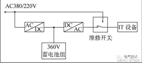 圖1為UPS的構(gòu)成圖。在線式UPS運(yùn)行的工作過程為整流(AC/DC)—浮充—逆變(DC/AC)—輸出;市電中斷時(shí)360V蓄電池組經(jīng)逆變電路保障IT設(shè)備的電能供給;UPS故障時(shí),將維修開關(guān)轉(zhuǎn)入市電旁路維持供電。