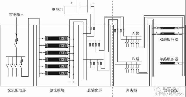 圖4為240V高壓直流供電系統(tǒng)圖(通信行業(yè)標(biāo)準(zhǔn)YD/T 2378-2011圖A.1)。由圖中可以看出,電池組經(jīng)熔斷器與整流模塊輸出端在總輸出屏構(gòu)成輸出母排,系統(tǒng)兩路輸出(A路和B路),通過列頭柜配電,來滿足雙電源服務(wù)器的需求,而單電源服務(wù)器僅使用A路或B路。