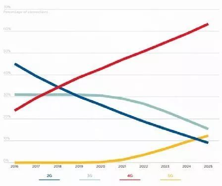 圖1 無線網(wǎng)絡(luò)發(fā)展曲線預(yù)測(來源:GSMA,2017)