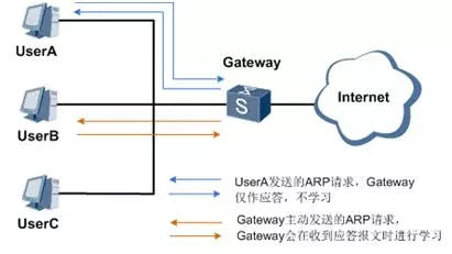 對于Gateway收到UserA發(fā)送來的ARP請求報文,Gateway不添加也不更新UserA對應(yīng)的ARP表項。如果該請求報文請求的是Gateway的MAC地址,那么Gateway會向UserA回應(yīng)ARP應(yīng)答報文。