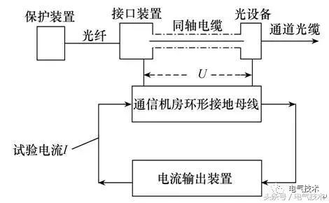 為查明原因,筆者進(jìn)行了相關(guān)試驗(yàn)。如圖4所示,用直流電流輸出裝置在通信機(jī)房的環(huán)形等電位接地網(wǎng)中通入試驗(yàn)電流,測量接口裝置屏的接地引下線與光設(shè)備屏的接地引下線之間的電壓U,當(dāng)電壓U達(dá)到1.7V左右時(shí),保護(hù)裝置發(fā)生通道異常。這說明當(dāng)?shù)鼐W(wǎng)中流過電流時(shí),確實(shí)會引起保護(hù)裝置通道異常[3]。