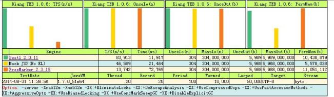 可以看出,代表Beetl的綠色的,性能高于代表JSP的黃色大約2倍。