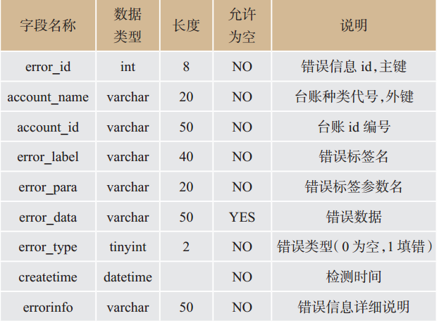 表4 臺(tái)賬錯(cuò)誤信息表的表結(jié)構(gòu)(sy_errorinfo)Tab.4 Account data error information