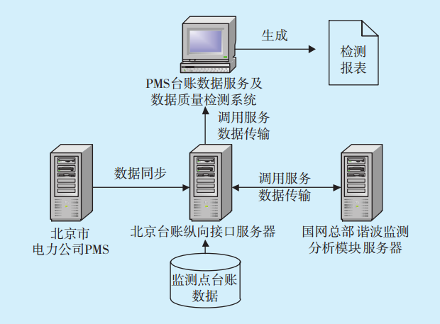 系統(tǒng)物理結(jié)構(gòu)如圖1所示。臺(tái)賬縱向接口程序?qū)?guó)網(wǎng)北京市電力公司PMS中的數(shù)據(jù)與電能質(zhì)量監(jiān)測(cè)系統(tǒng)的監(jiān)測(cè)點(diǎn)臺(tái)賬數(shù)據(jù)同步到接口服務(wù)器,打包成Web服務(wù),在特定的服務(wù)端口發(fā)布,國(guó)家電網(wǎng)公司總部諧波監(jiān)測(cè)分析模塊服務(wù)器可通過(guò)訪問(wèn)北京接口服務(wù)器調(diào)用接口服務(wù),獲取所需數(shù)據(jù)。本次實(shí)現(xiàn)的PMS臺(tái)賬數(shù)據(jù)服務(wù)及數(shù)據(jù)質(zhì)量檢測(cè)系統(tǒng)也可調(diào)用接口服務(wù)器的服務(wù),獲取返回XML數(shù)據(jù),進(jìn)行數(shù)據(jù)的解析檢測(cè),生成檢測(cè)報(bào)表文件。