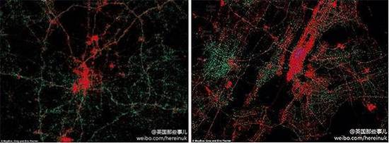 圖中紅點是用iPhone的人,綠點是用安卓的人。這兩張在微博上看到的圖,第一張是美國一個城市的一覽,第二張圖特寫了紐約的市中心,尤其是曼哈頓地區(qū)。我們可以看到在市中心和主干道的人用iPhone居多,而用安卓的人都在郊區(qū)。這也引起了人們的熱議,有的說在美國富人都住郊區(qū)別墅,所以富人愛用安卓手機;有的反駁說曼哈頓地區(qū)的人幾乎都用iPhone,說明富人喜歡用iPhone手機。不管結論如何,都足以說明用戶都被這些圖所吸引,所以可視化的方式效果真的很直觀。