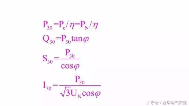 當(dāng)只有一臺用電設(shè)備時,不能直接按表取需要系數(shù),這是因為影響需要系數(shù)的幾個因素除用電設(shè)備本身的效率η外均可能為1,此時的需要系數(shù)只包含了效率η,因此可得到P30 =Pe /η,由P30 、Q30 、S30 、I30 之間的關(guān)系得到如下公式: