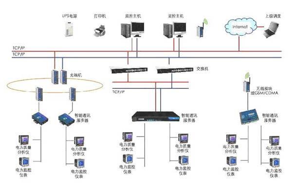 包括智能電力數(shù)據(jù)采集器(智能電表)、GPRS數(shù)據(jù)通訊網(wǎng)絡(luò)、數(shù)據(jù)采集服務(wù)器。所有智能數(shù)據(jù)采集單元相對獨(dú)立,按供電回路出線和負(fù)荷對應(yīng)分布式配置,就地安裝在電氣柜內(nèi)或線路上,完成對工作點(diǎn)數(shù)據(jù)的采集和測量,通過GPRS無線網(wǎng)絡(luò),上傳到數(shù)據(jù)采集服務(wù)器。