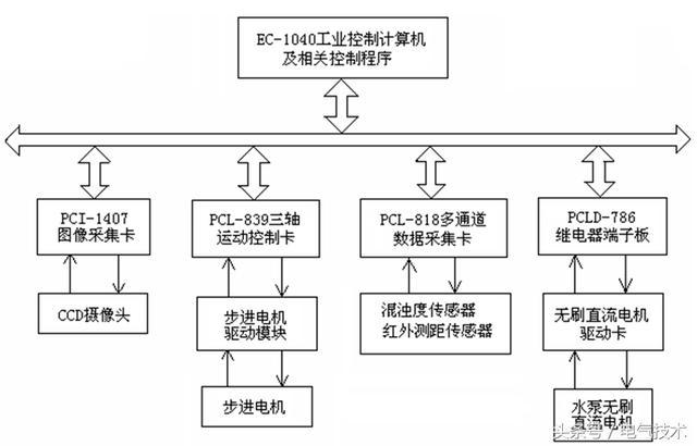 從清洗器操作和控制的要求及產(chǎn)品的性價比等諸方面考慮工控機選用了威達電公司的EC—1040,自帶LCD顯示屏,方便建立人機界面。研華公司的PCL—818數(shù)據(jù)采集卡用于濁度傳感器的信號處理和清洗器定位轉(zhuǎn)向紅外開關(guān)的信號檢測,PCL—839三軸步進電機控制卡用于清洗器驅(qū)動步進電機的控制,還選擇了美國NI公司的PCL—1407圖像采集卡用于CCD攝像器的視頻信號處理。清洗器控制系統(tǒng)框圖見圖5。