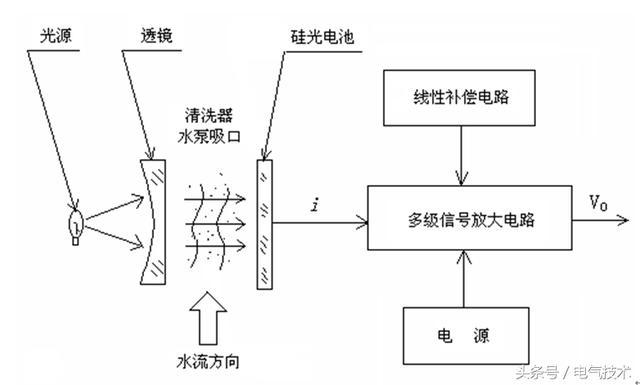 光電式混濁度傳感器的工作原理見圖4;當鹵鎢燈點亮后,提供了傳感器所需要的光源。光線經(jīng)過透鏡的折射,均勻地聚集在硅光電池上。硅光電池的伏安特性將光信號轉(zhuǎn)換成電信號,經(jīng)線性補償,由多級放大器對信號的比較放大后,輸出Vo到工控機中的PCL-818數(shù)據(jù)采集卡,計算機控制程序可以根據(jù)水泵吸口處水質(zhì)的混濁度(反映為混濁度傳感器的信號強弱)輸出相應(yīng)的脈沖來調(diào)節(jié)清洗器驅(qū)動用步進電機的轉(zhuǎn)速,從而提高清洗的工作效率。