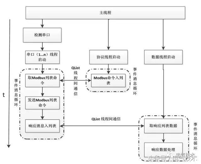 算法設(shè)計(jì)基于Qt應(yīng)用程序開發(fā)框架,功能實(shí)現(xiàn)采用QList列表類和QThread線程類。主程序讀取XML配置文件,根據(jù)所配置串口模式開啟串口通信線程,串口線程之間互不影響,支持不同modbus功能函數(shù)同時(shí)運(yùn)行,每個(gè)串口modbus數(shù)據(jù)采集命令發(fā)送和數(shù)據(jù)接收作為子線程并行運(yùn)行,系統(tǒng)資源耗費(fèi)更少,數(shù)據(jù)處理方式更高效;根據(jù)modbus數(shù)據(jù)啟動(dòng)modbus數(shù)據(jù)解析線程,用QList作為線程間通信方法,方便數(shù)據(jù)擴(kuò)展,保證程序穩(wěn)定、高效運(yùn)行。算法設(shè)計(jì)如圖4所示。