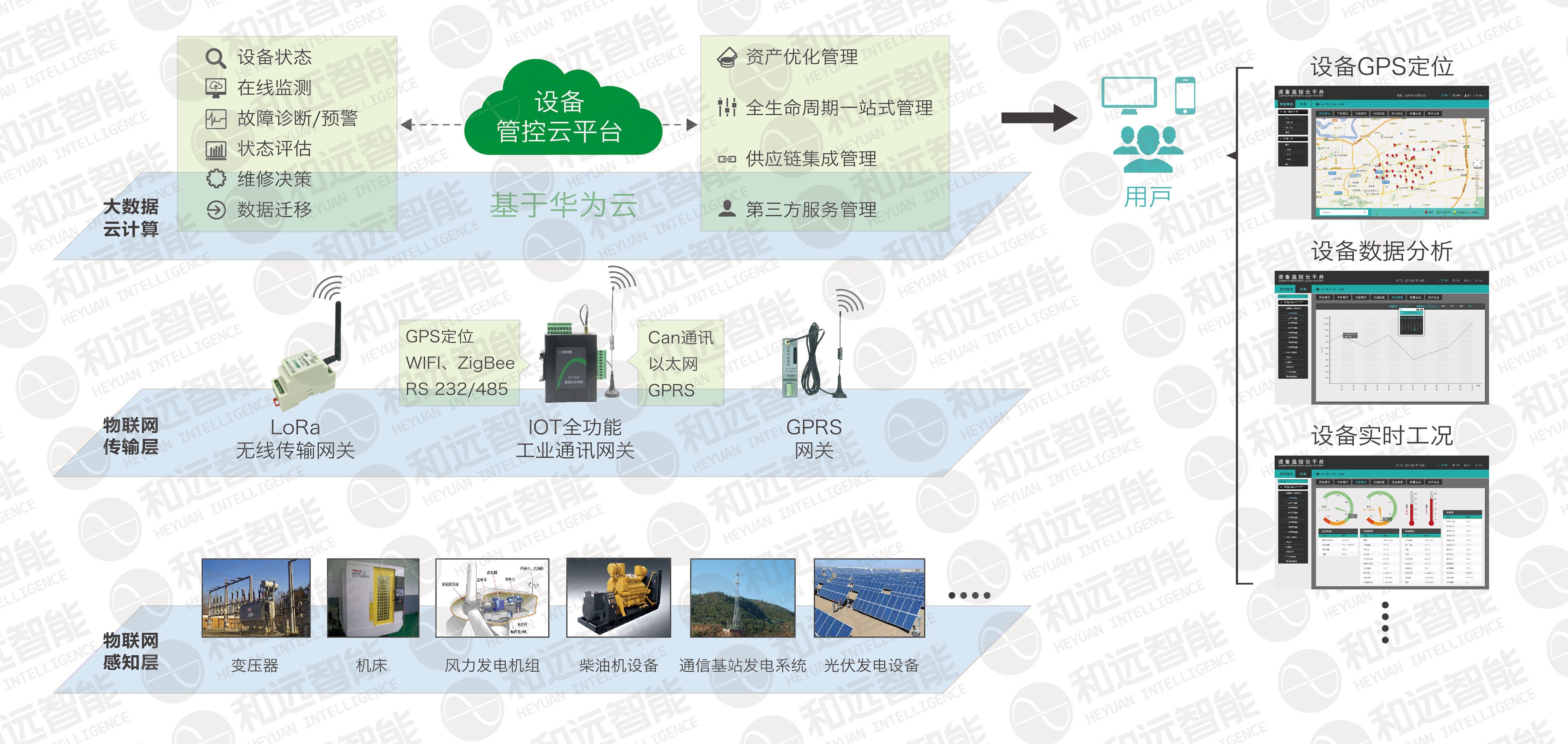 設(shè)備監(jiān)控系統(tǒng)針對設(shè)備監(jiān)控與管理存在的諸多問題,采用先進的傳感器與智能傳感終端,運用物聯(lián)網(wǎng)技術(shù)對設(shè)備進行全面的感知監(jiān)控。和遠智能設(shè)備監(jiān)控系統(tǒng)采用四層架構(gòu),從物聯(lián)網(wǎng)感知層到傳輸層到分析層再到用戶SaaS應(yīng)用層,從設(shè)備數(shù)據(jù)全時段監(jiān)測到云平臺大數(shù)據(jù)分析處理,給客戶打造適合企業(yè)運行狀態(tài)的定制化設(shè)備監(jiān)控系統(tǒng)解決方案。