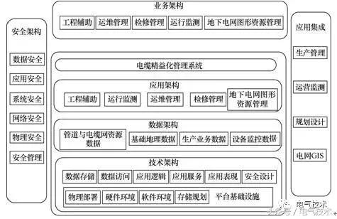 通過(guò)與北京電網(wǎng)GIS平臺(tái)進(jìn)行服務(wù)調(diào)用數(shù)據(jù)交換完成管道及電纜空間數(shù)據(jù)的共享與交換。電纜精益化管理系統(tǒng)的總體架構(gòu)由業(yè)務(wù)架構(gòu)、應(yīng)用架據(jù)、技術(shù)架構(gòu)、物理架構(gòu)、安全架構(gòu)和應(yīng)用集成等部分組成。系統(tǒng)總體架構(gòu)如圖1所示。