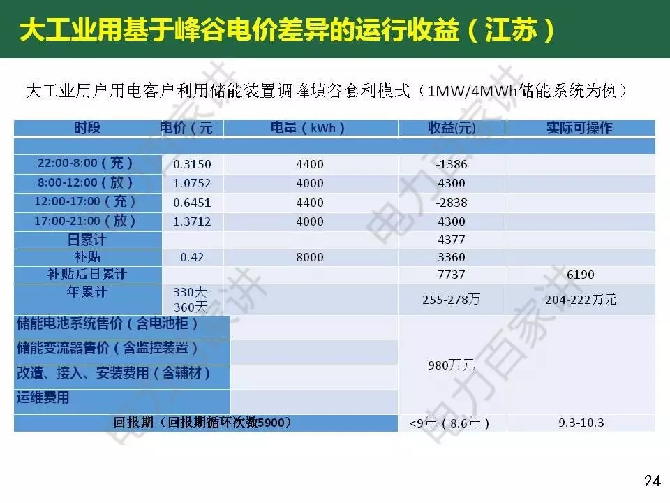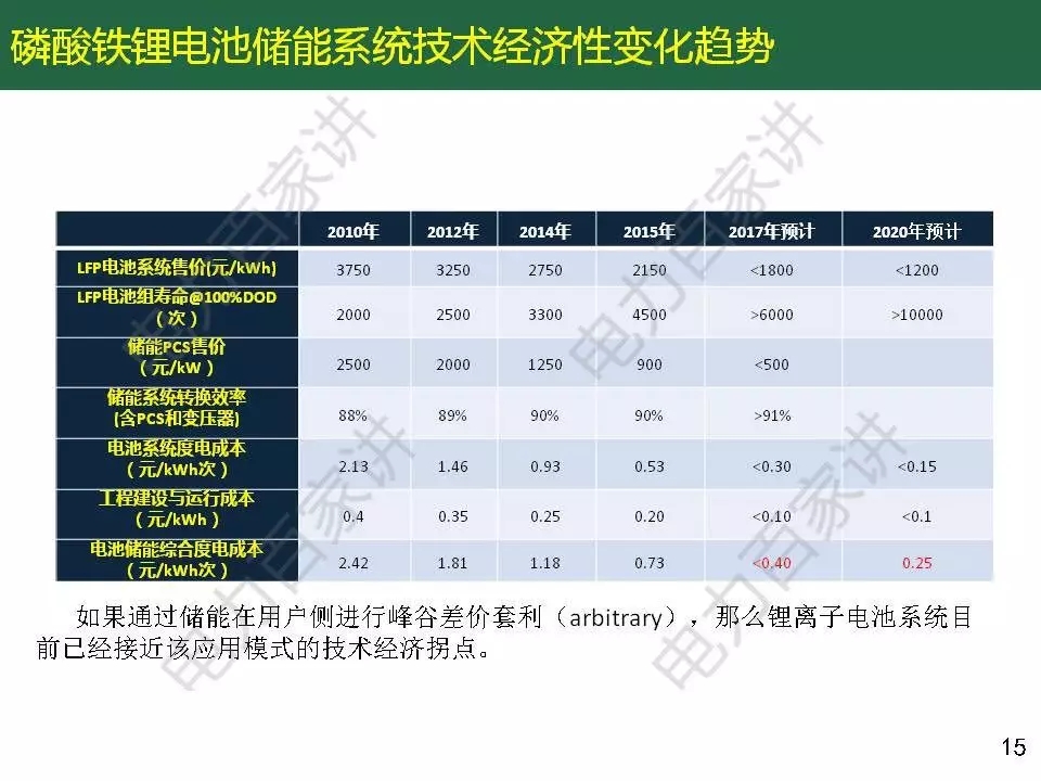 惠東教授還對目前商業(yè)化初期的儲能應(yīng)用經(jīng)濟(jì)性進(jìn)行了分析,他表示峰谷電價(jià)差套利的模式,價(jià)差要達(dá)到6毛以上,如果要在5年內(nèi)收回成本,電池系統(tǒng)價(jià)格要降到1.2元/wh以下(目前鋰電池系統(tǒng)價(jià)格在2000元/ kWh);解決棄風(fēng)問題的儲能應(yīng)用不具備經(jīng)濟(jì)價(jià)值,即使儲能價(jià)格再下降一半。