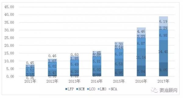 2011年—2017年全球不同類型鋰電池出貨量(GWh)
