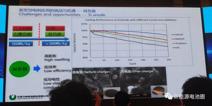 第二個報告來自天津力神王琳經(jīng)理,分享了炭黑,石墨烯,以及新型單壁碳管在硅負(fù)極的應(yīng)用現(xiàn)狀和問題。