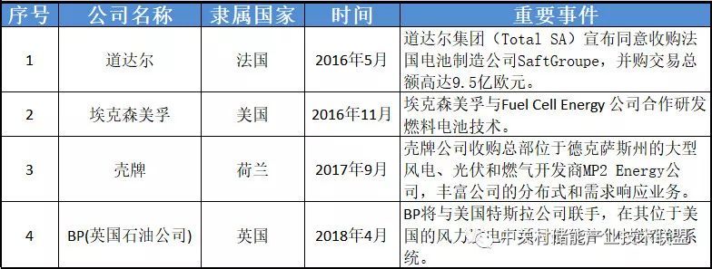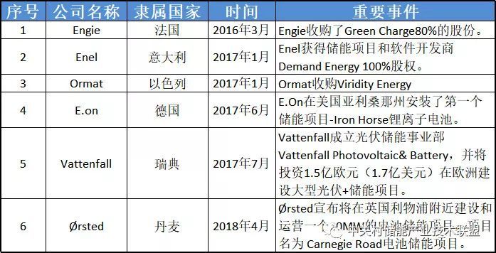 從目前新進(jìn)入的儲能業(yè)務(wù)公司類型來看,主要可以分為兩類:一類是以殼牌、BP為代表的國際石油、天然氣能源巨頭進(jìn)入儲能市場;另一類是以E.On為代表的電力綜合能源公司進(jìn)入儲能市場。