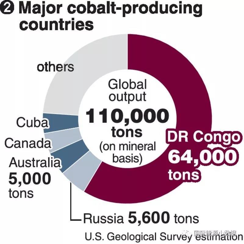 2017年全球金屬鈷的產(chǎn)量11萬噸,其中剛果(金)產(chǎn)量6.4萬噸,俄羅斯5600噸,澳大利亞5000噸。
