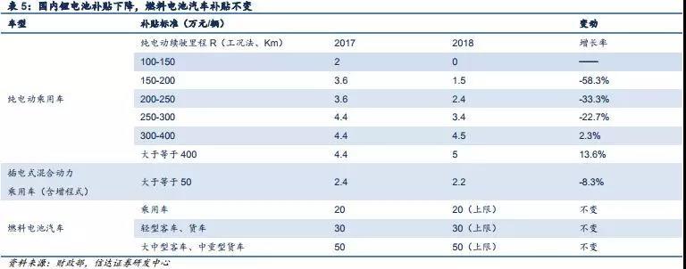 國內(nèi)方面補(bǔ)貼政策最早是在2009年出現(xiàn),主要形式是免征購置稅,同時(shí)還會在購買時(shí)給予一次性的不同額度的補(bǔ)貼。從補(bǔ)貼力度看,我國的補(bǔ)貼力度是最大的,按2017年標(biāo)準(zhǔn),僅乘用車補(bǔ)貼就高達(dá)20萬元/輛,高于日韓22000美元/輛的標(biāo)準(zhǔn),大型客貨則高達(dá)50萬元/輛,遠(yuǎn)超出國外最高額度。2018年補(bǔ)貼有所調(diào)整,原來對應(yīng)的20、30、50萬元/輛,分別調(diào)整為對應(yīng)補(bǔ)貼上限。