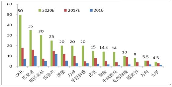 近兩年動(dòng)力電池企業(yè)紛紛快速擴(kuò)張產(chǎn)能。政策方面,國(guó)家頒布的《促進(jìn)汽車(chē)動(dòng)力電池產(chǎn)業(yè)發(fā)展行動(dòng)方案》(2017.3)明確要求到2020 年動(dòng)力電池行業(yè)總產(chǎn)能超過(guò)1000 億瓦時(shí),形成產(chǎn)銷(xiāo)規(guī)模在400 億瓦時(shí)以上、具有國(guó)際競(jìng)爭(zhēng)力的龍頭企業(yè)。2016 年新能源車(chē)產(chǎn)銷(xiāo)量約52 萬(wàn)輛,同比增長(zhǎng)約52%,對(duì)應(yīng)動(dòng)力電池需求約為28.3GWh;2017 年新能源汽車(chē)產(chǎn)銷(xiāo)量估計(jì)可實(shí)現(xiàn)70 萬(wàn)輛以上(同比增長(zhǎng)35%以上),則動(dòng)力電池總需求量預(yù)計(jì)將達(dá)34.0GWh(同比增長(zhǎng)約20%); 如按國(guó)家規(guī)劃目標(biāo)2020 年新能源汽車(chē)產(chǎn)銷(xiāo)量200 萬(wàn)輛,預(yù)計(jì)2020 年動(dòng)力電池市場(chǎng)總需求為124.3GWh,相當(dāng)二2016 年的4.4 倍。假設(shè)按平均1.0 元/Wh 進(jìn)行測(cè)算,2020 年國(guó)內(nèi)車(chē)用動(dòng)力鋰電池市場(chǎng)規(guī)模約為1243億元,為2016 年的2.1 倍左右。