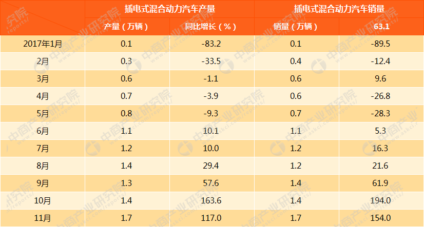 2017年11月中國插電式混合動(dòng)力汽車產(chǎn)銷量