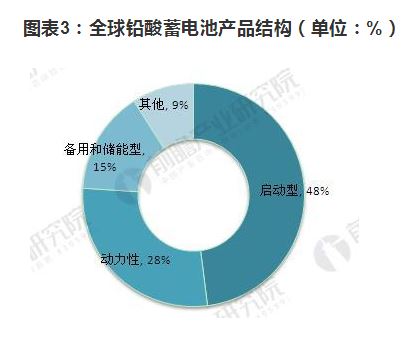 鉛酸蓄電池為世界上產(chǎn)量最大的電池產(chǎn)品,生產(chǎn)量占全部電池總量的50%,占充電電池的70%,即便是歐美日等世界上最發(fā)達(dá)的國(guó)家和地區(qū),至今也仍大量生產(chǎn)和使用鉛酸蓄電池。在鉛酸蓄電池產(chǎn)品結(jié)構(gòu)中,啟動(dòng)型鉛酸蓄電池占比最大,達(dá)到48%,其次是動(dòng)力型鉛酸蓄電池,占比為28%,備用與儲(chǔ)能型鉛酸蓄電池占比為15%。