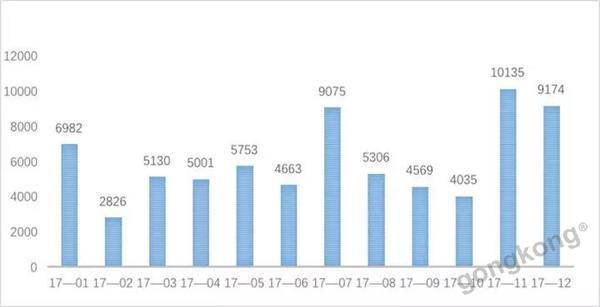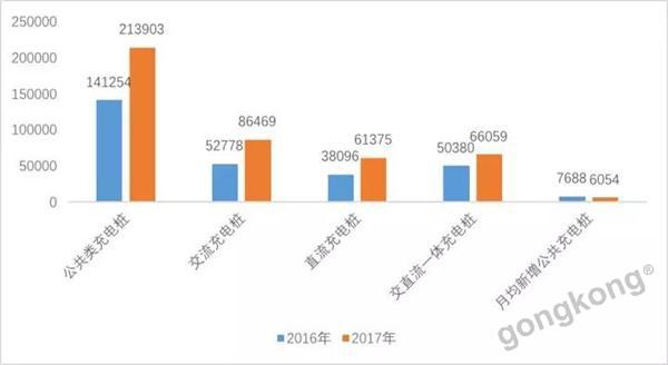 2017年全年月均新增公共類充電樁月6054個(gè),相較2016年月均增長(zhǎng)量下降1000多個(gè),增速稍有放緩。