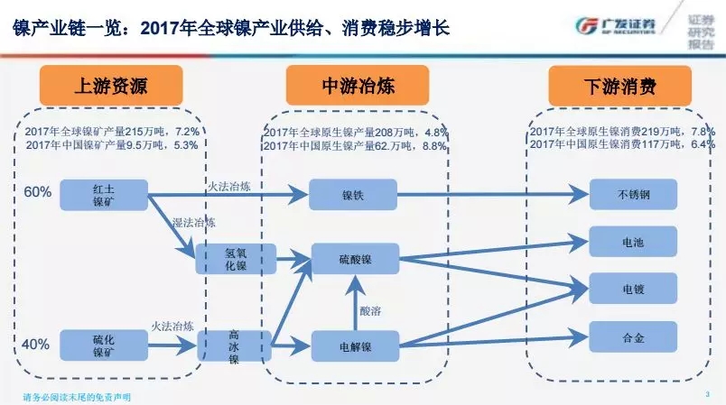 鎳整體來講,最主要的原材料是紅土鎳礦和硫酸鎳礦,紅土鎳礦目前是全球最主要的全球供應(yīng)來源,但是紅土鎳礦通常的產(chǎn)品是鎳鐵,再通過鎳鐵生產(chǎn)不銹鋼。有的朋友會說,圖中從紅土鎳礦到氫氧化鎳到硫酸鎳這條線路是有的,沒錯,理論上是可行的,但現(xiàn)在全球一共有兩家企業(yè)投這種生產(chǎn)線,一家企業(yè)投了60億美金,一家企業(yè)大約投了30億人民幣,雖說去年年底開始試生產(chǎn),但產(chǎn)品似乎還沒有那么穩(wěn)定、那么快。這塊相對來講投資規(guī)模比較大,這么大的投資規(guī)模是否能夠非常順利的生產(chǎn)還存在一定不確定性。前段時間我見到一個上市公司朋友,他說能夠通過一些相對來講比較低成本的方式,能夠從紅土鎳礦當(dāng)中提出硫酸鎳,我聽到這個消息很興奮,因?yàn)檫@確實(shí)是一門好生意。鎳有沒有機(jī)會?有機(jī)會,但是風(fēng)險(xiǎn)在哪里,機(jī)會在于哪里,就在于紅土鎳礦是否能夠順利作出硫酸鎳。