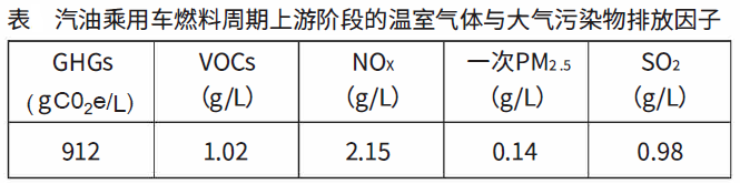 汽油乘用車(chē)燃料周期上游階段的溫室氣體與大氣污染物排放因子如下表所示——