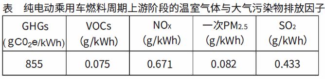純電動(dòng)乘用車(chē)燃料周期上游階段的溫室氣體與大氣污染物排放因子如下表所示——