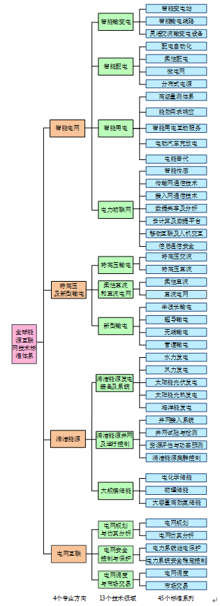 標(biāo)準(zhǔn)體系的第1層是專業(yè)方向(大領(lǐng)域)。包括智能電網(wǎng)、特高壓及新型輸電、清潔能源和電網(wǎng)互聯(lián)等4個方向。