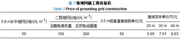 針對(duì)不同布置方式的二層地網(wǎng)和深井接地極進(jìn)行計(jì)算,比較其降阻效果和經(jīng)濟(jì)性。本文的經(jīng)濟(jì)性比較主要是估算靜態(tài)投資,靜態(tài)投資包括施工費(fèi)用和材料費(fèi)用兩項(xiàng)。根據(jù)變電站接地網(wǎng)施工報(bào)價(jià),接地網(wǎng)建設(shè)所需的施工費(fèi)用如表2所示,材料費(fèi)用單價(jià):水平地網(wǎng)為52元/m和2.5 m短垂直接地極為56.5元/根。